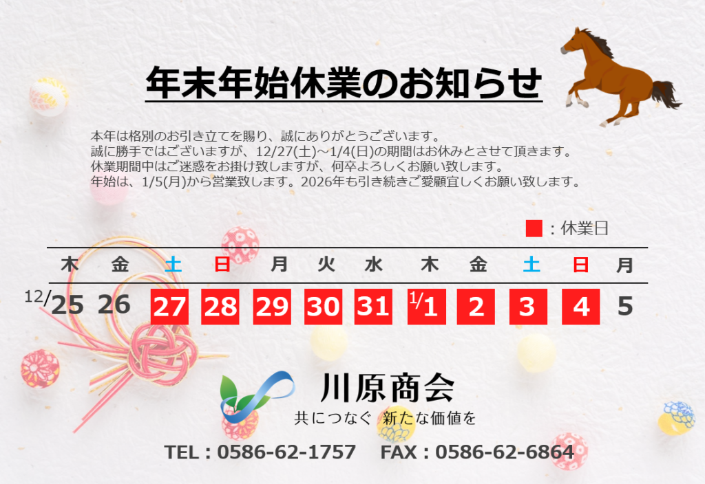 年末年始休業のお知らせ 2025.12.08 日頃より、川原商会をご利用いただき誠にありがとうございます。 誠に勝手ながら12/27(土)~1/4(日)は年末年始休業日とさせていただきます。休業期間中はご迷惑をおかけいたしますが、何卒よろしくお願い申し上げます。